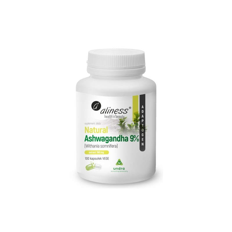 Natural Ashwagandha 9% to suplement diety zawierający wysokiej jakości ekstrakt wyłącznie z korzenia ashwagandhy (Withania somnifera), standaryzowany jednocześnie na 8% witanolidów oraz 1% alkaloidów. Każda kapsułka dostarcza 560 mg ekstraktu, co zapewnia powtarzalną zawartość substancji aktywnych.