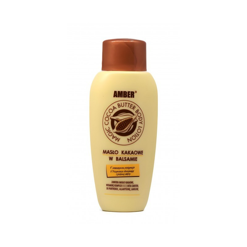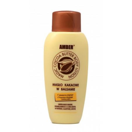 Masło Kakaowe w Balsamie 200 ml Amber to zaawansowany kosmetyk do intensywnej pielęgnacji skóry. Jego unikalna formuła zawiera masło kakaowe oraz bogaty kompleks witamin E, C, F, Beta-karoten, de-panthenol, allantoinę i lanolinę. Doskonale nawilża i natłuszcza skórę, przywracając równowagę lipidową i zapewniając ochronę przez cały rok.
