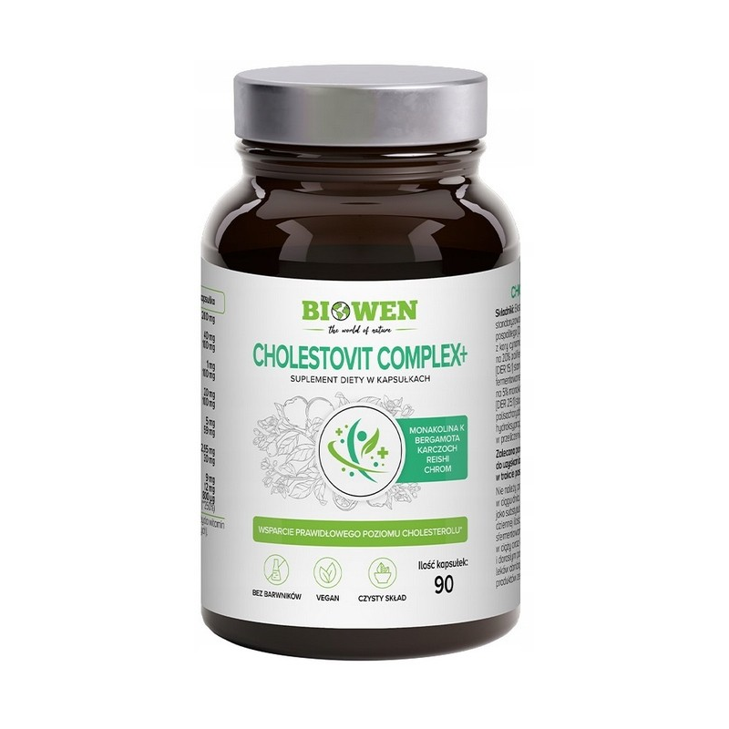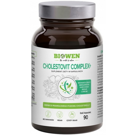 Cholestovit Complex+ Biowen to suplement diety w postaci kapsułek, przeznaczony dla osób dorosłych. Zawiera standaryzowane ekstrakty roślinne oraz chrom w formie pikolinianu. W składzie znajdują się ekstrakty z bergamoty, czosnku, cynamonu, karczocha, fermentowanego czerwonego ryżu oraz reishi. Czosnek dba o zdrowie serca, wpływa na lipidy we krwi, wspiera wątrobę oraz zdrowie naczyń krwionośnych i odporność. Karczoch dba o zdrowie serca i ma wpływ na lipidy krwi oraz pomaga utrzymać normalny poziom cholesterolu. Cynamon wpływa na układ sercowo-naczyniowy oraz wspiera układ nerwowy. Reishi dba o prawidłowy poziom cholesterolu we krwi i zdrowie układu krążenia. Chrom pomaga utrzymać prawidłowe stężenie glukozy we krwi oraz ma swój udział w metabolizmie makroskładników.
