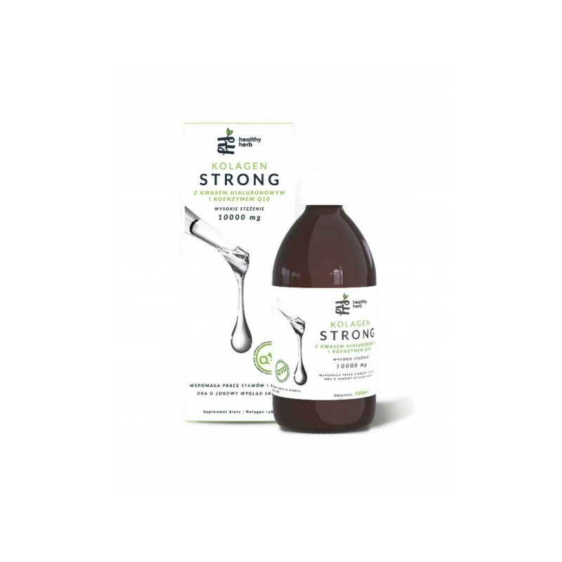Kolagen STRONG to suplement diety w postaci płynu, przygotowany na bazie hydrolizowanego kolagenu rybiego typu I i III. Formuła została wzbogacona o kwas hialuronowy, koenzym Q10, witaminę C, kompleks witamin z grupy B oraz ekstrakty roślinne. Produkt przeznaczony jest do codziennego uzupełniania diety osób poszukujących wygodnej formy suplementacji kolagenu w płynie.