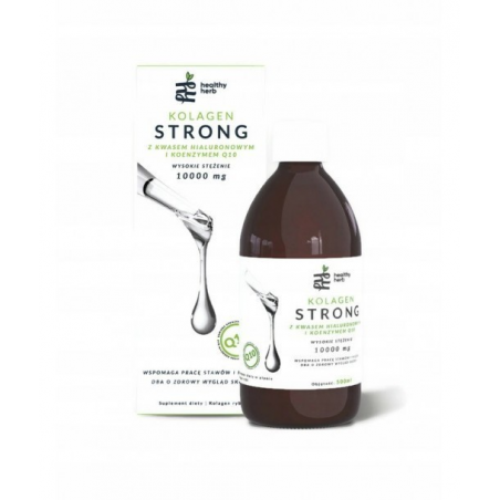 Kolagen STRONG to suplement diety w postaci płynu, przygotowany na bazie hydrolizowanego kolagenu rybiego typu I i III. Formuła została wzbogacona o kwas hialuronowy, koenzym Q10, witaminę C, kompleks witamin z grupy B oraz ekstrakty roślinne.