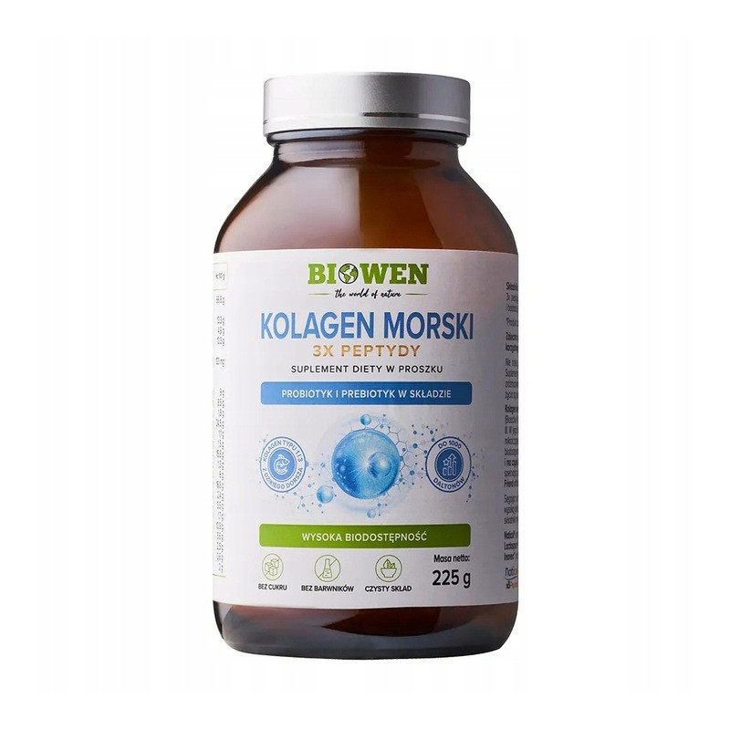 Biowen Kolagen Morski 3× Peptydy to suplement diety w postaci proszku, przeznaczony dla osób dorosłych. Zawiera kolagen rybi typu I i III pozyskiwany z dzikiego dorsza w formie peptydów Naticol®, uzupełniony o witaminę C, prebiotyk z akacji i baobabu oraz probiotyk Bacillus coagulans. Produkt nie zawiera cukru i został opracowany jako element codziennej, zbilansowanej diety.