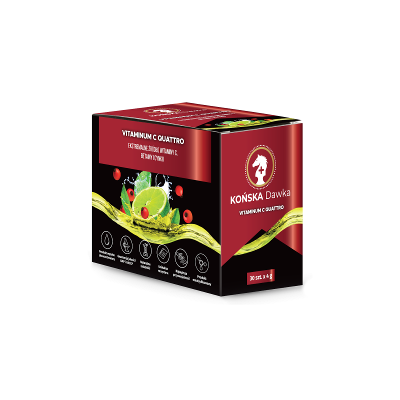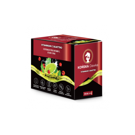 Witamina C quattro to innowacyjny suplement diety w formie saszetek, zawierający 30 porcji po 4g wysokiej dawki. Jest on produkowany przez renomowaną firmę Końska Dawka, znana z wysokiej jakości swoich produktów.